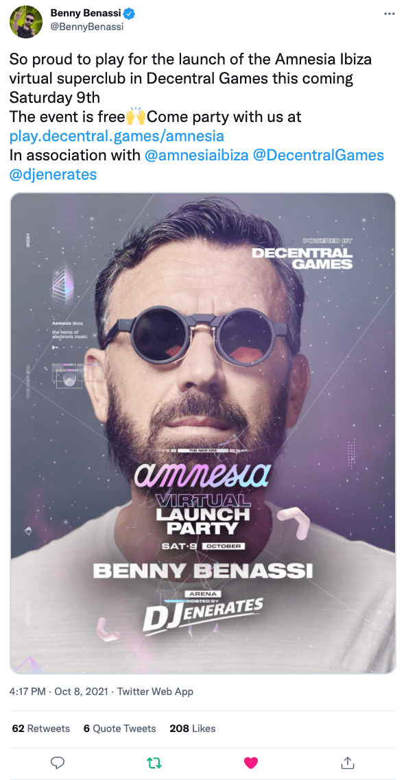 Apr 27, 2021 · in partnership with decentral games, amnesia ibiza will launch its own virtual dancefloors in the ethereum metaverse. For further information head to www.amnesia.es. Just sign up & start! See why up to 18 million people per month organize events and volunteers with signupgenius. Tickets for the event are already sold out, but you can join the waiting list on the official amnesia website.